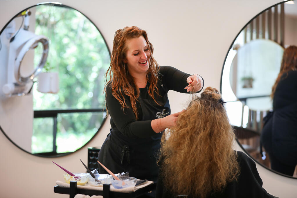 Curlture Salon co-owner Lydia Carpenter works on multi-dimensional lightening with a customer in Santa Rosa on Thursday, March 21, 2024. (Christopher Chung/The Press Democrat)